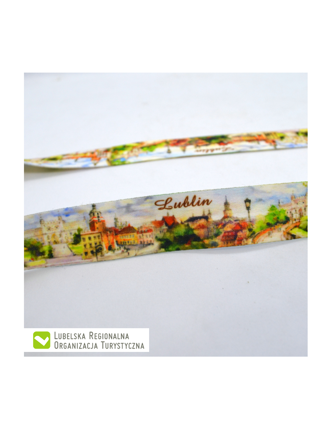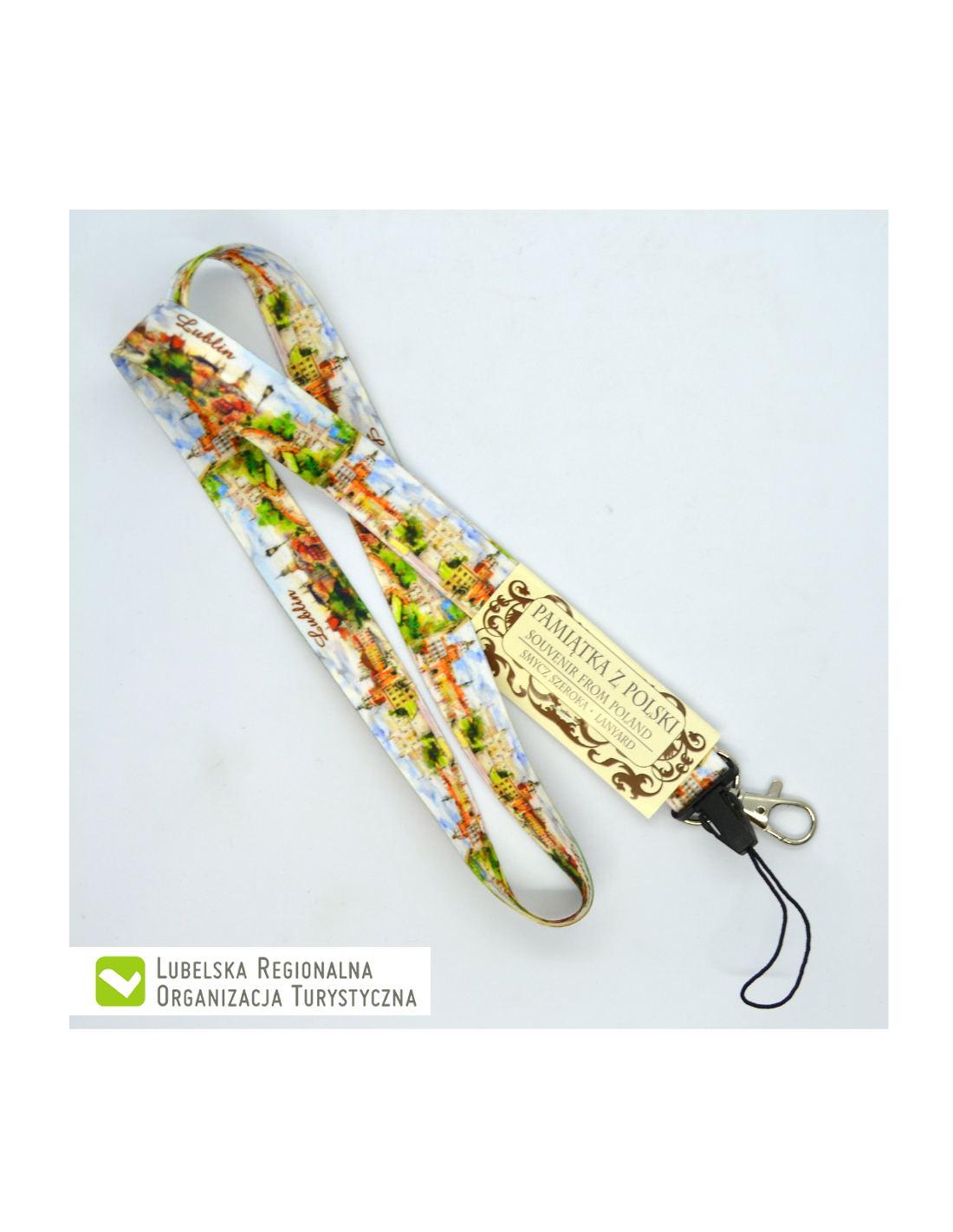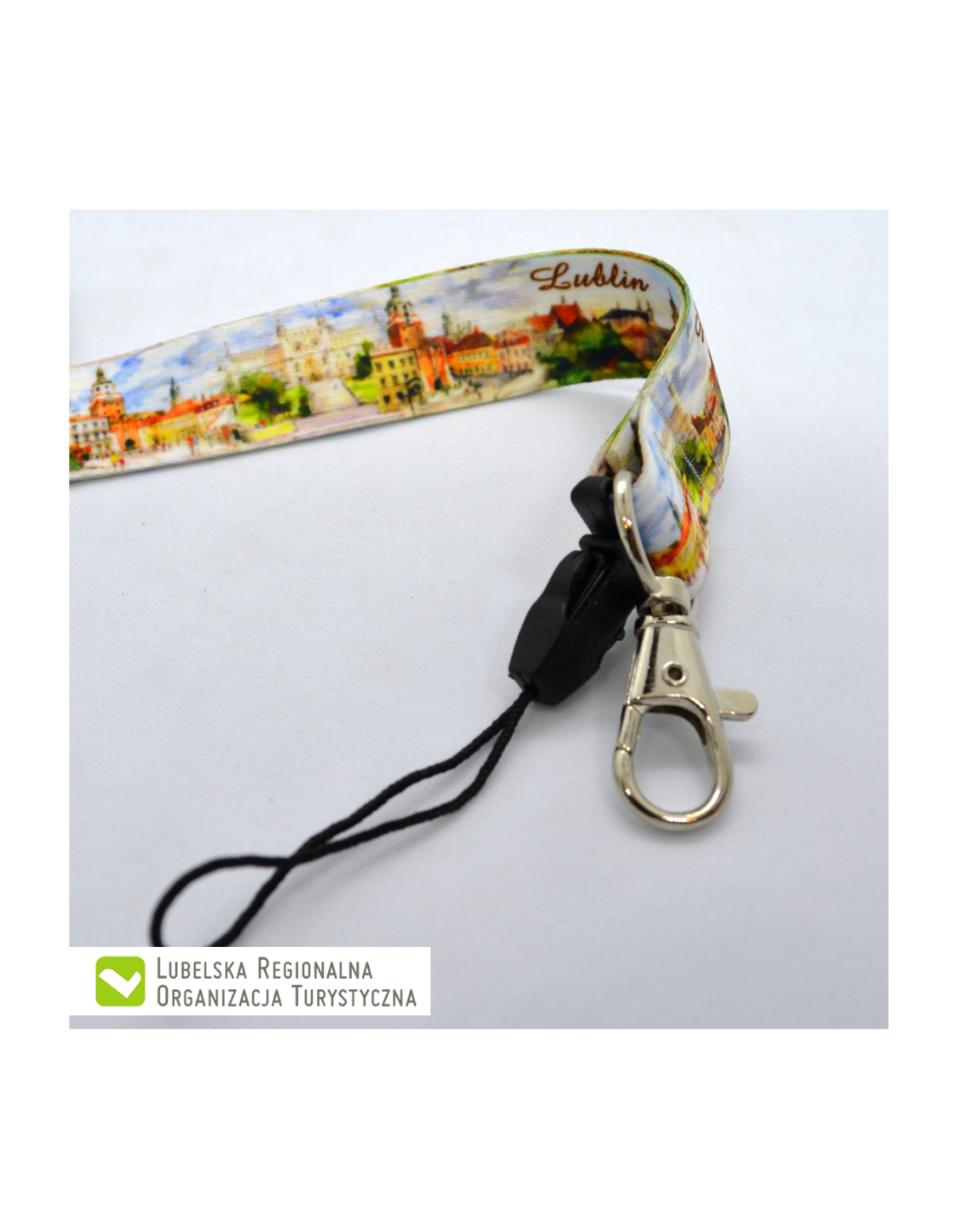 Zakończona metalowym karabińczykiem i plastikową szybkozłączką do np. telefonu komórkowego.