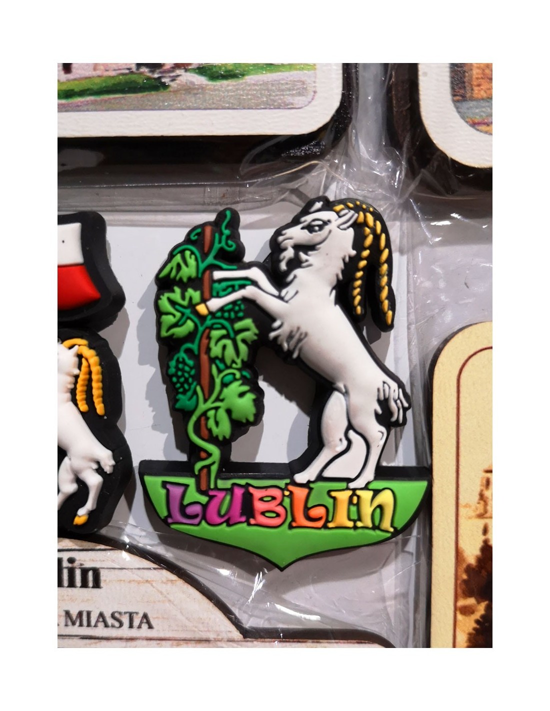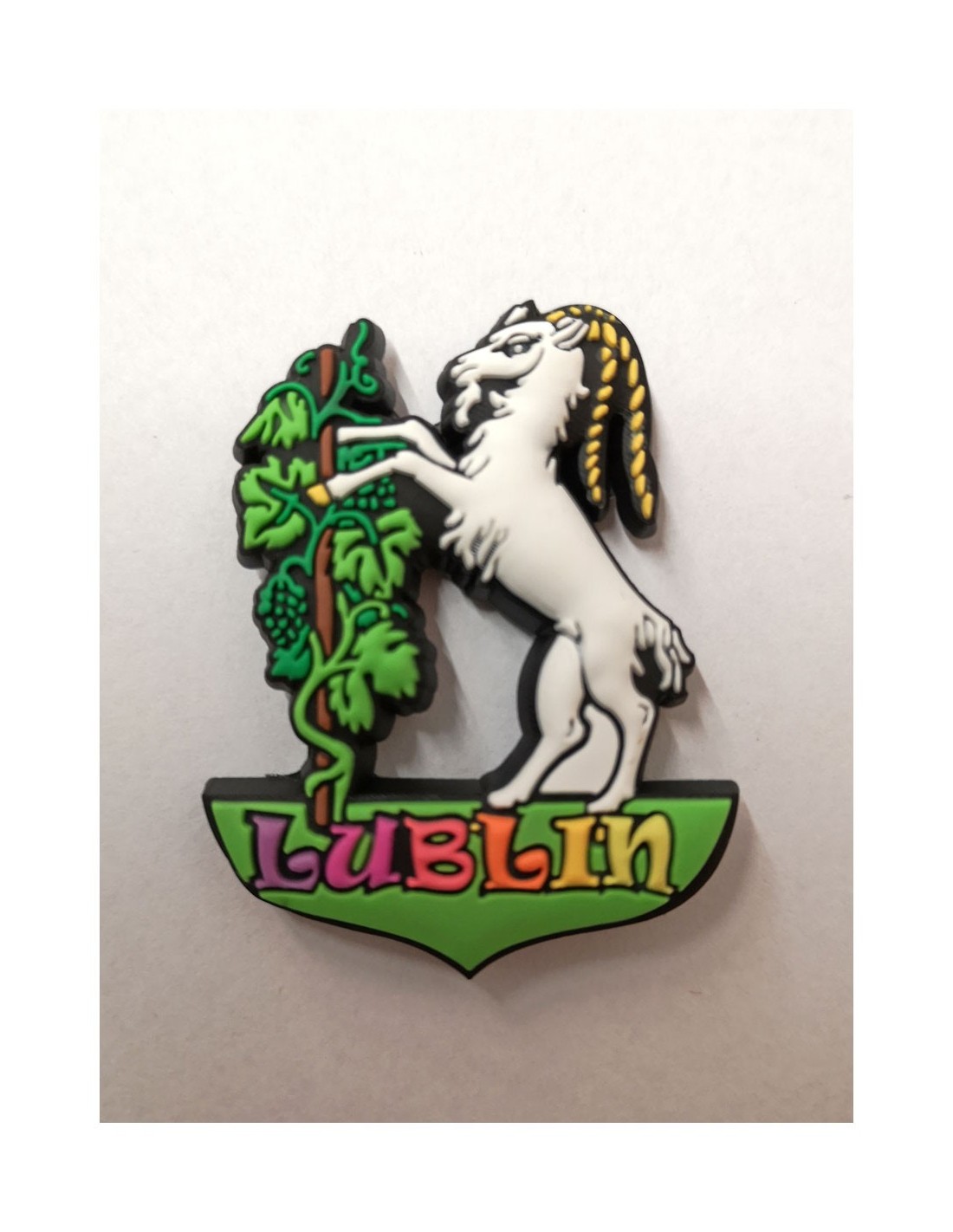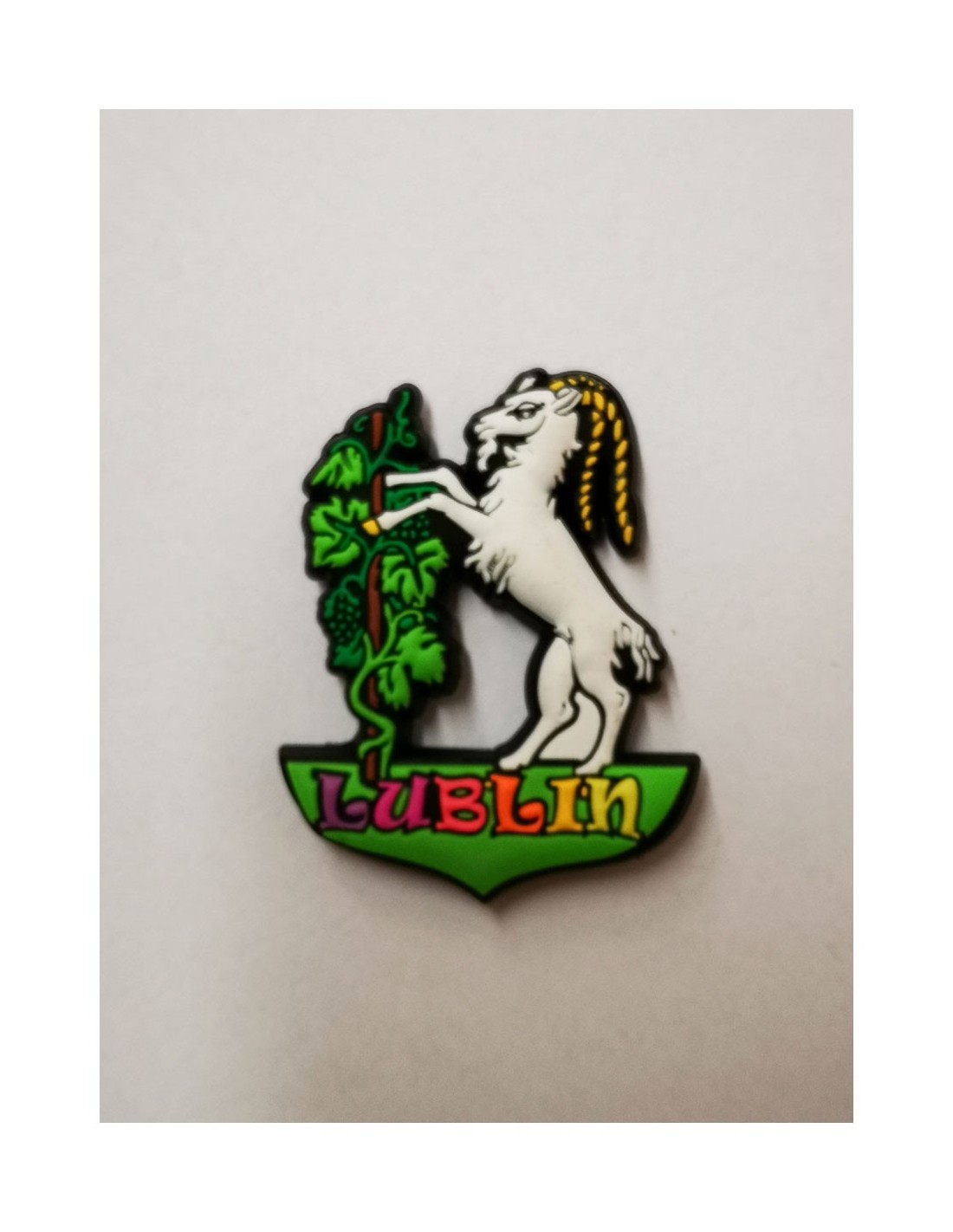 Pamiątkowy, kolorowy magnes na lodówkę z sympatycznym lubelskim koziołkiem i napisem Lublin.