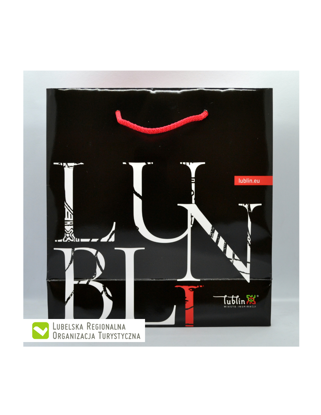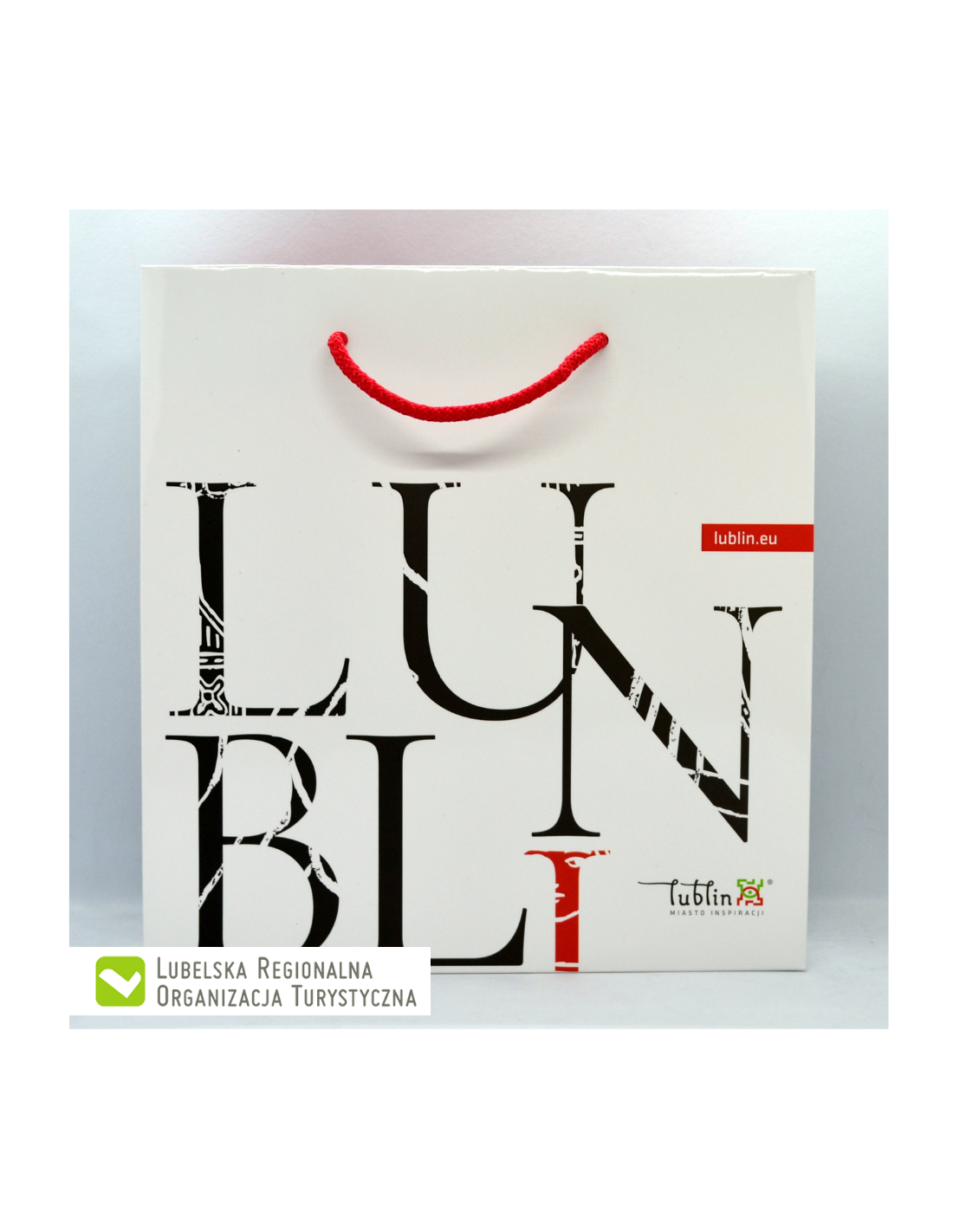 Prezentowa torba papierowa z nowoczesną grafiką i logo Lublina.