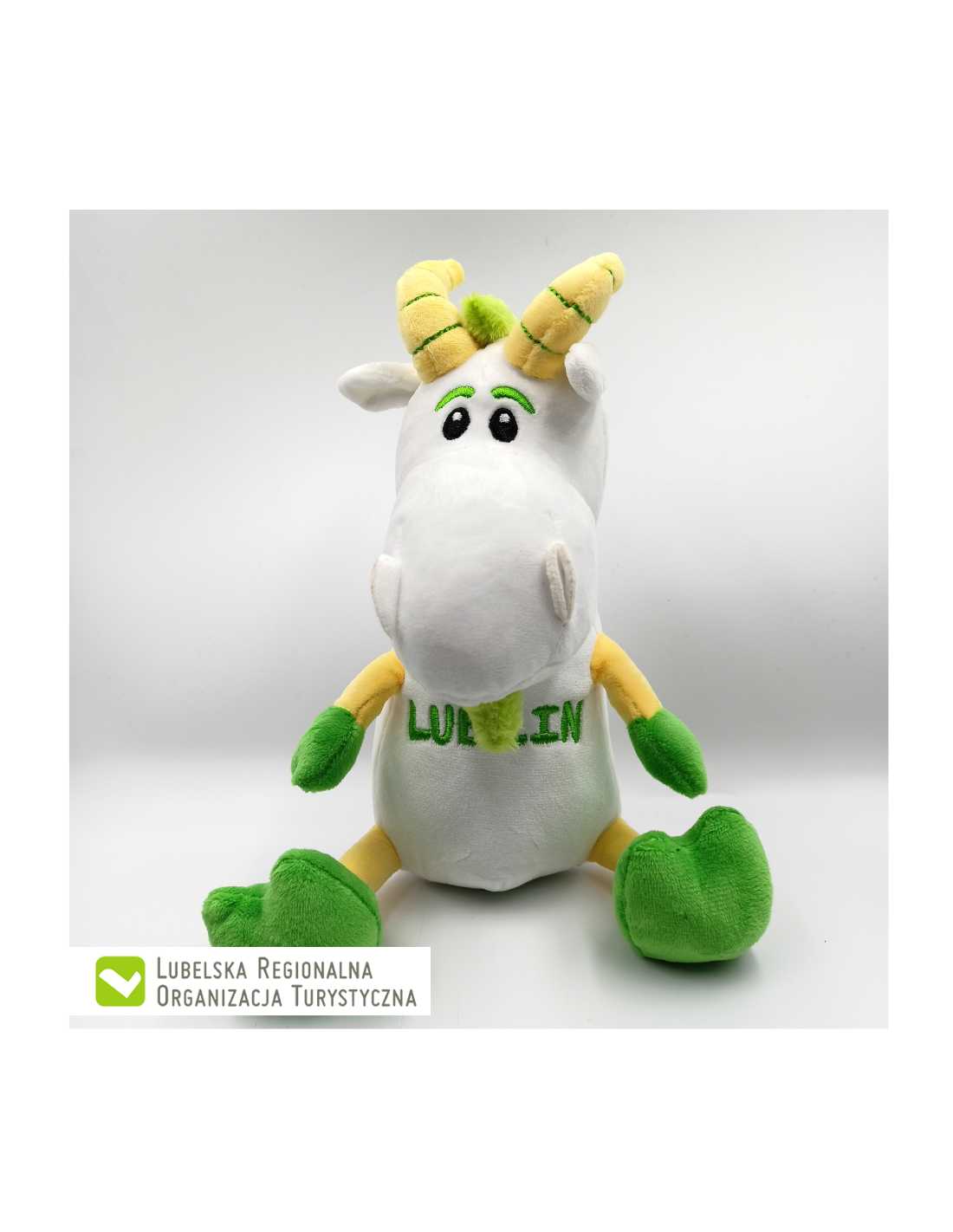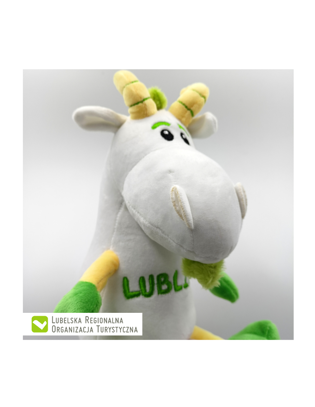 Koziołek z herbu Lublina w wersji dla dzieci. Urocza pluszowa zabawka, maskotka w postaci biało-zielonego, siedzącego koziołka. Na brzuchu ma on wyhaftowany napis "Lublin". Materiał z którego wykonano zabawkę jest miękki i przyjemny w dotyku.